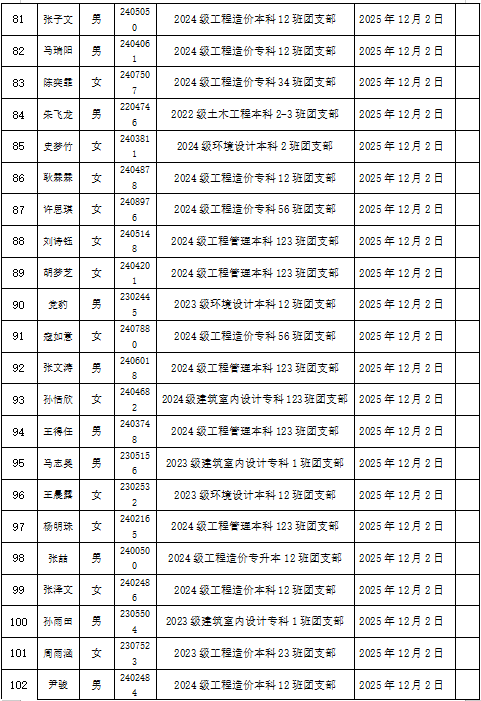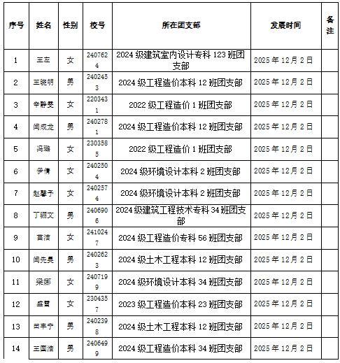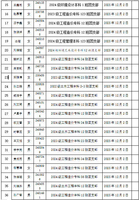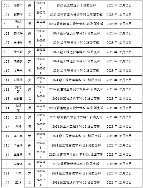 根据《中国共产主义青年团章程》、《青岛恒星科技学院团员发展工作细则》等相关要求,经本人自愿申请、团员推荐、团支部考察、综合在校表现,经过严格审定,拟推荐王左等122名同学发展成为我院2025年度新团员,具体名单公示如下: